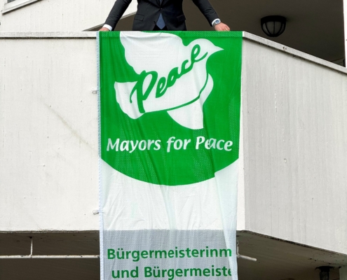Flagge „Mayors for Peace“ weht am Rathaus