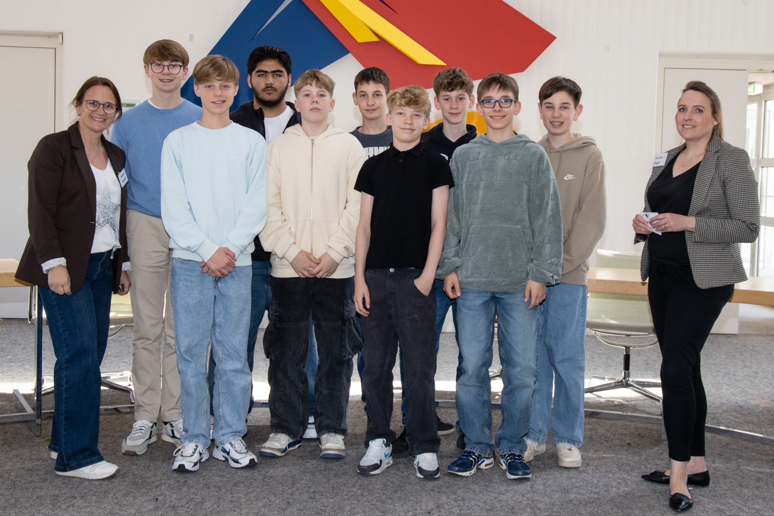 Nadine Batzella (Fachdienstleitung Soziales) und Annette Engels (Stabstelle Strategie, Projekte und Controlling) mit Teilnehmern des Boys`Days