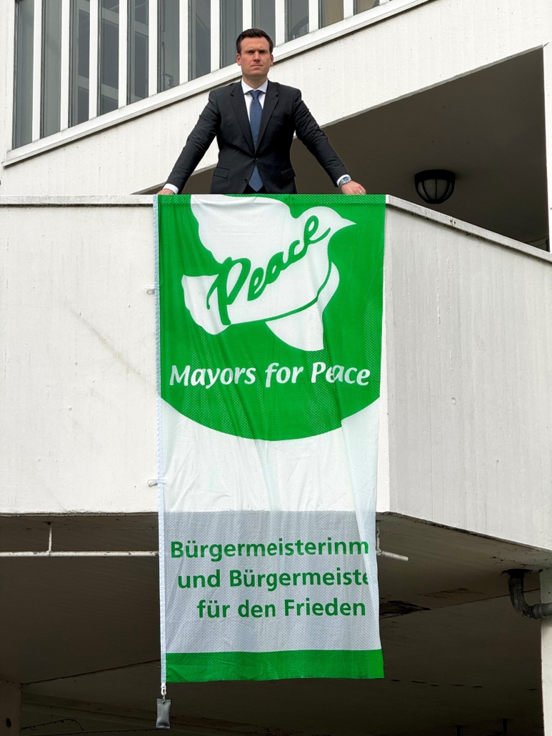 Bürgermeister Philipp Herzog setzt mit der Flagge der Mayors for Peace am Rathaus ein sichtbares Zeichen für Frieden und Solidarität.
