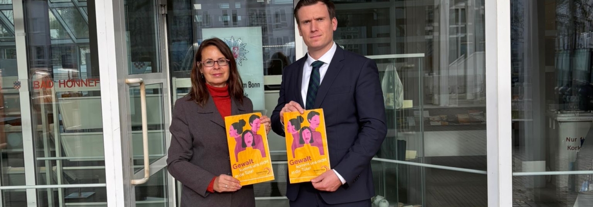 Vor der neuen orangen Bank unterstützen Bürgermeister Philipp Herzog und Gleichstellungsbeauftragte Iris Schwarz die kreisweite Brötchentütenaktion „Gewalt kommt uns nicht in die Tüte“.