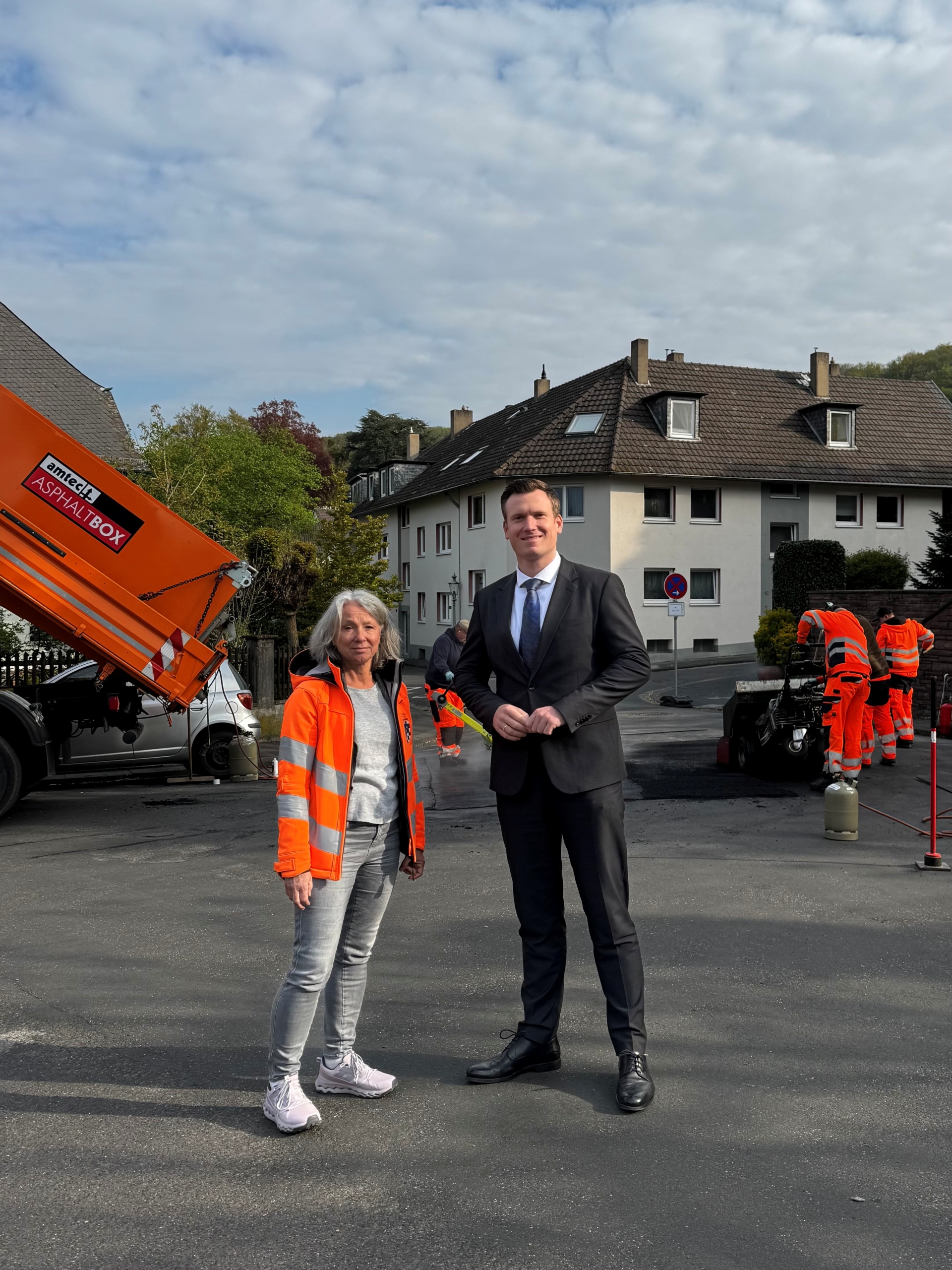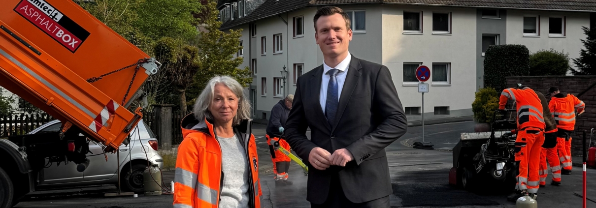 Im Rahmen der Schlagloch-Offensive nehmen Bürgermeister Philipp Herzog und Jutta Schmidt, Leiterin des Fachdienstes Tiefbau, das städtische Straßen- und Wegenetz in den Blick.