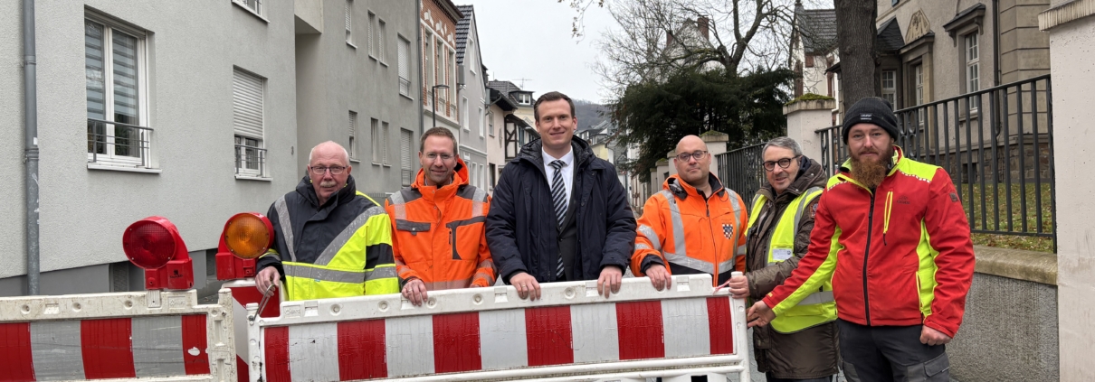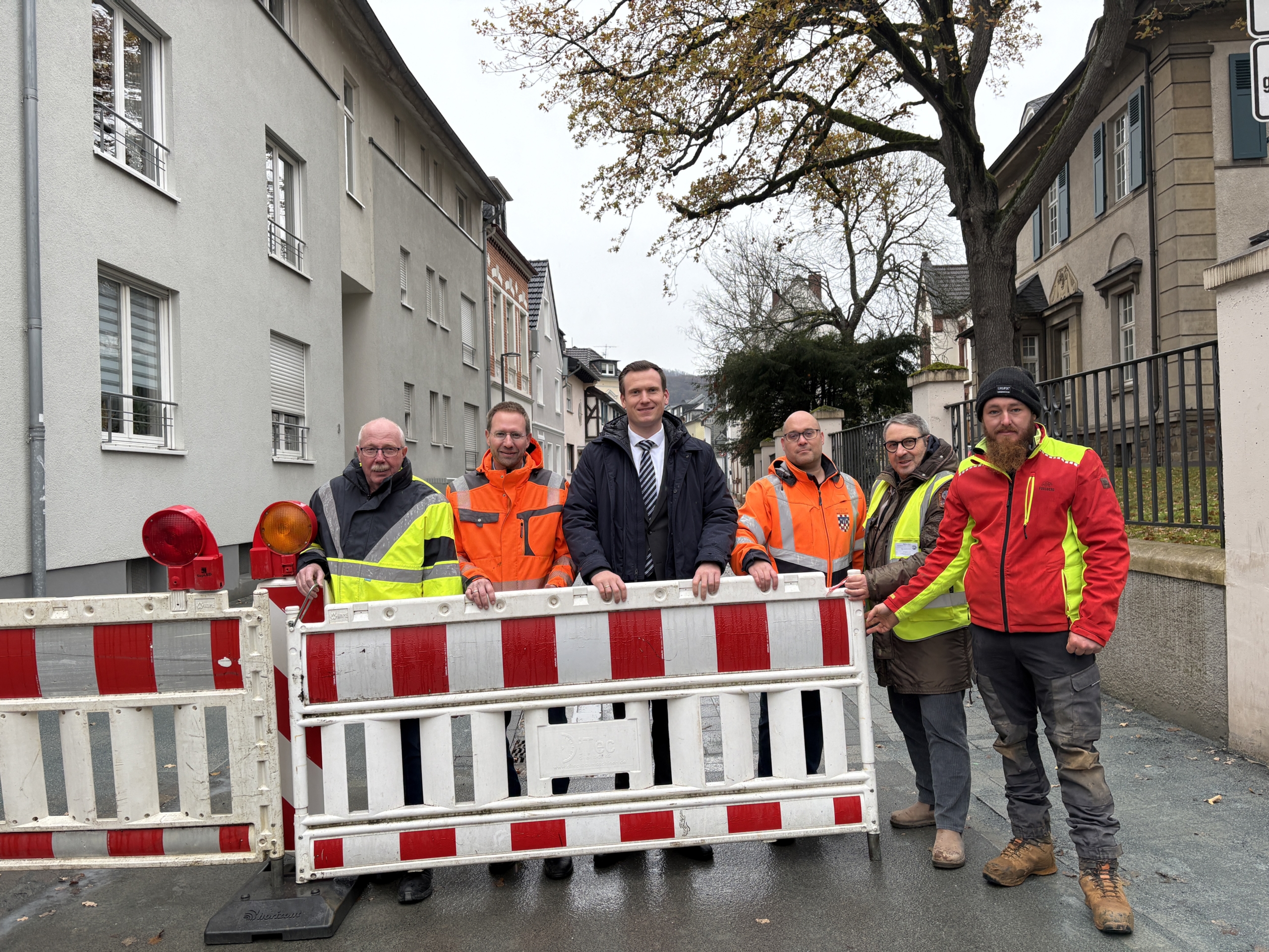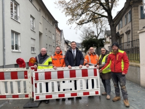 Mit tatkräftiger Unterstützung gab Bürgermeister Philipp Herzog (3. von links) heute (2.12.) den ersten Teilabschnitt der Rommersdorfer Straße wieder für den Verkehr frei.