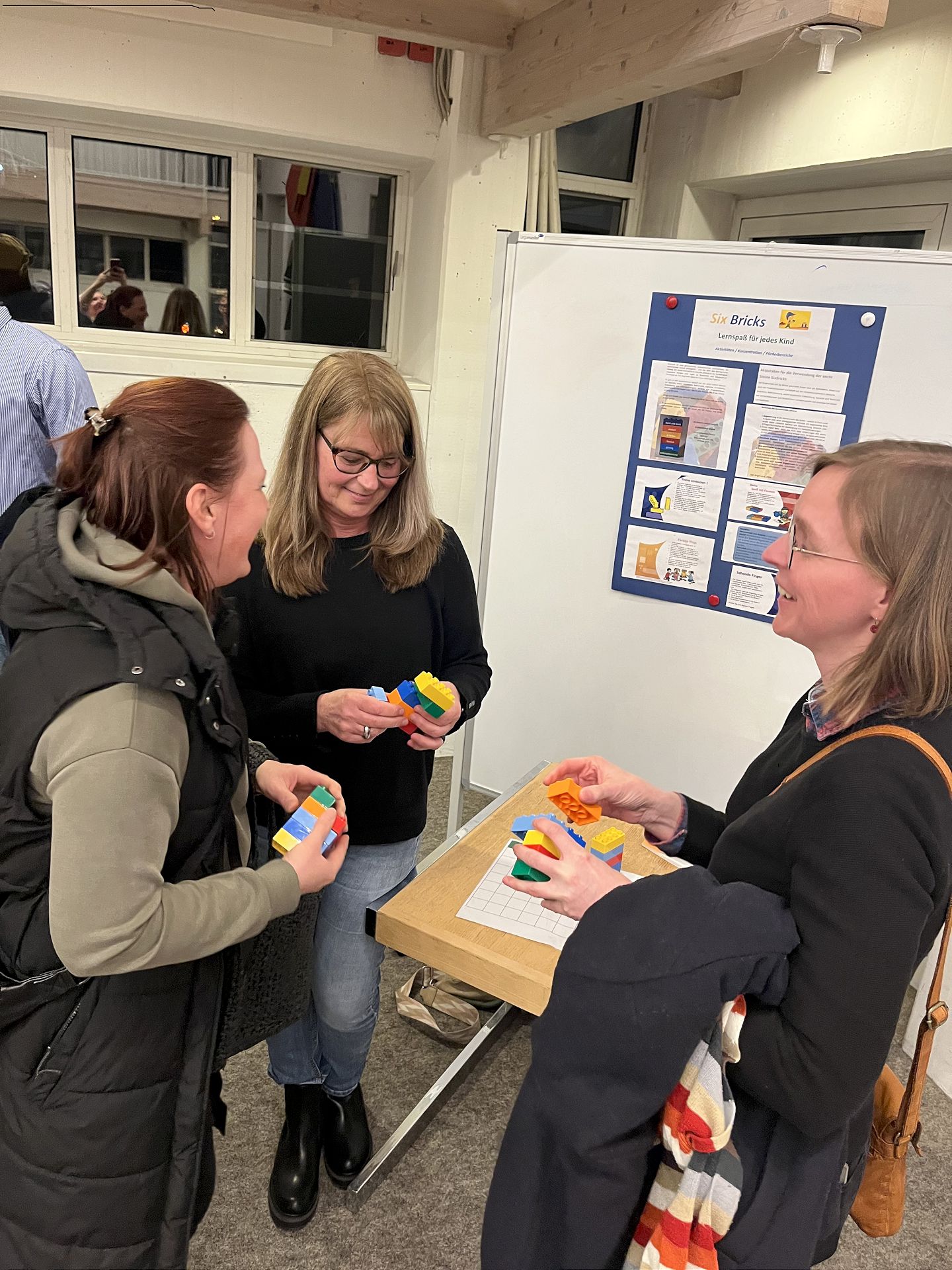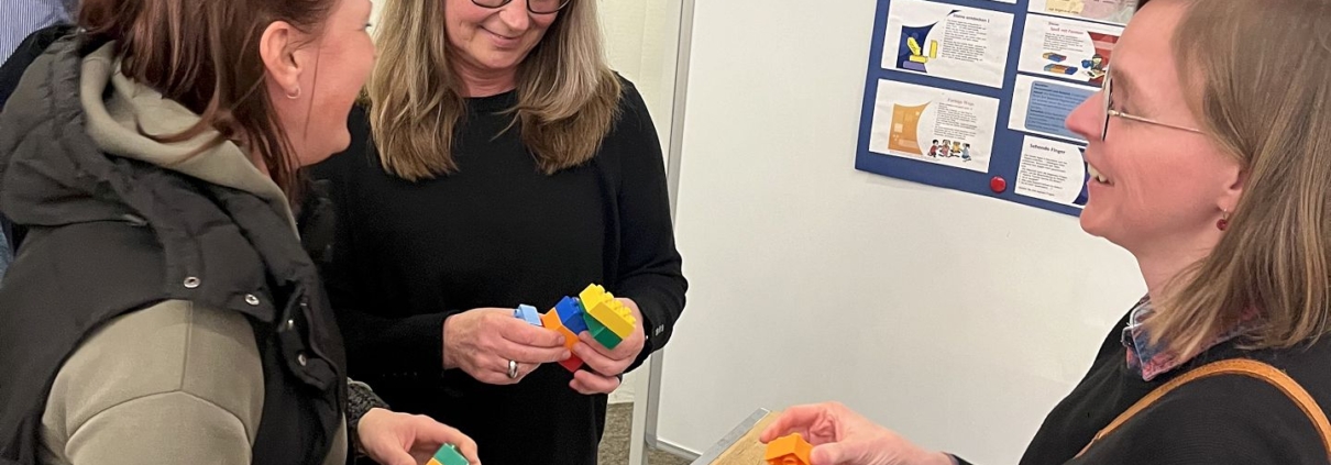 Eva Nowka (Mitte), Leiterin des Familienzentrums „St. Aegidius“, und interessierte Eltern erkunden die Lernmethode SixBricks – den Lernspaß für jedes Alter.